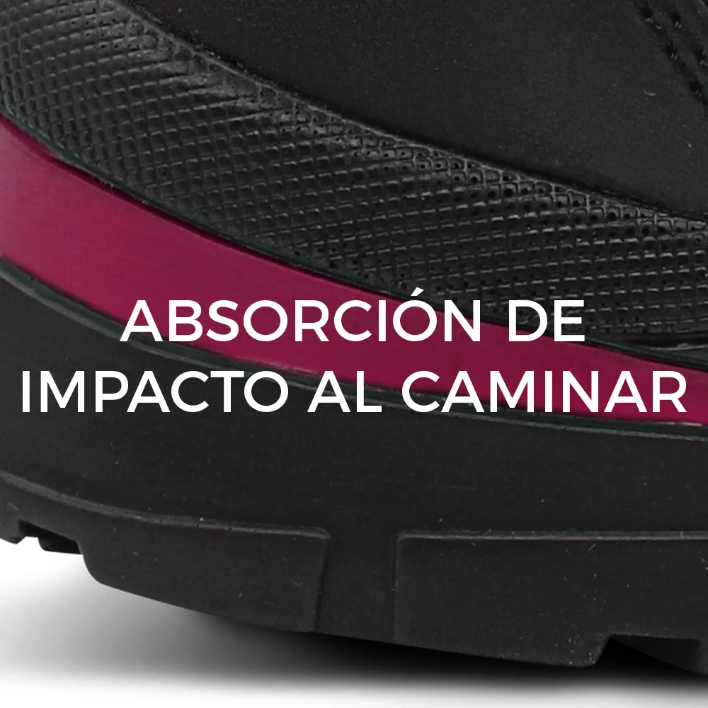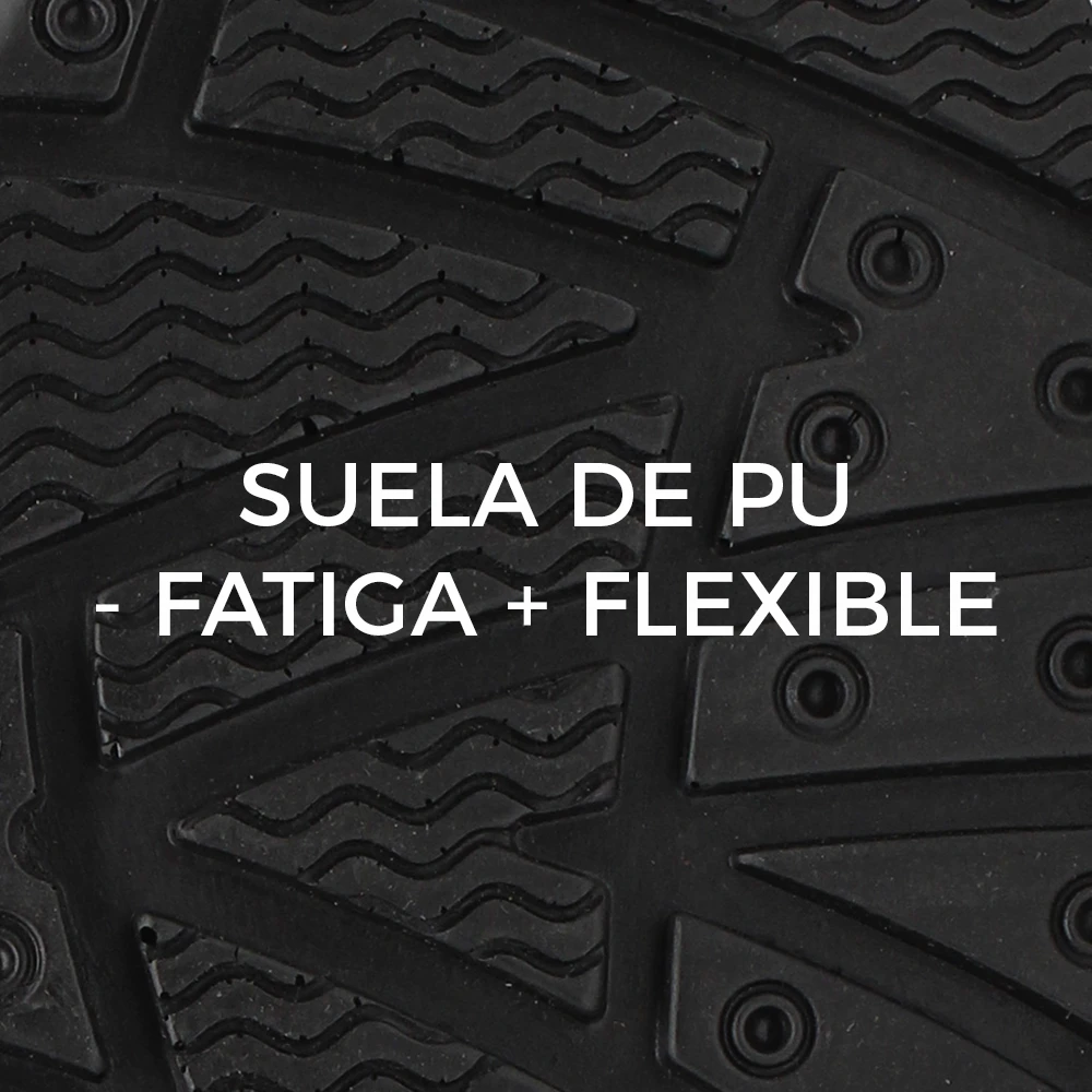 Suela de poliuretano con buena resistencia a la abrasión moderada y agarre en pisos secos y mojados en baja concentración. No recomendado en entornos con agua o líquidos abundantes.