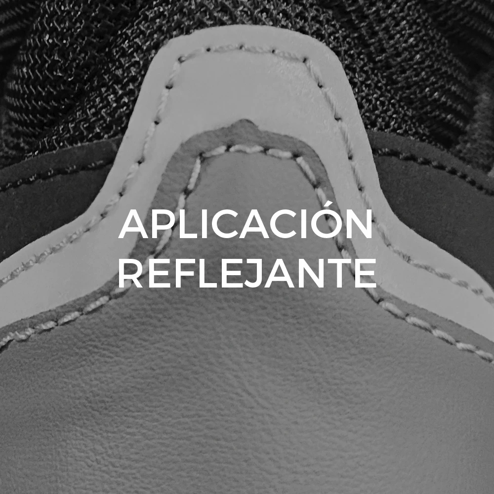 Forros internos en material textil transpirable, plantilla ergonómica en espuma de poliuretano 7 mm con perforaciones, casco de policarbonato más ligero y resistente a impactos y compresiones.