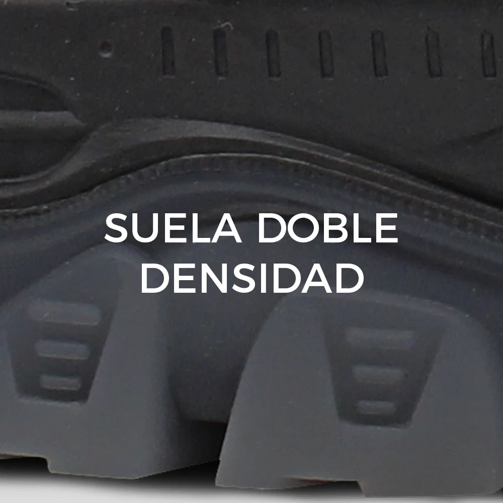 Suela doble densidad en poliuretano + TPU antiderrapante con buena resistencia a la abrasión moderada y agarre en pisos secos y mojados.