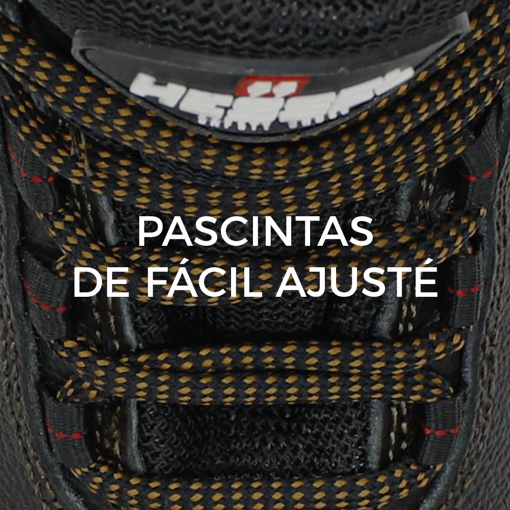 Forros internos en material textil transpirable, plantilla ergonómica en espuma de poliuretano 7 mm con perforaciones, casco de policarbonato más ligero y resistente a impactos y compresiones.